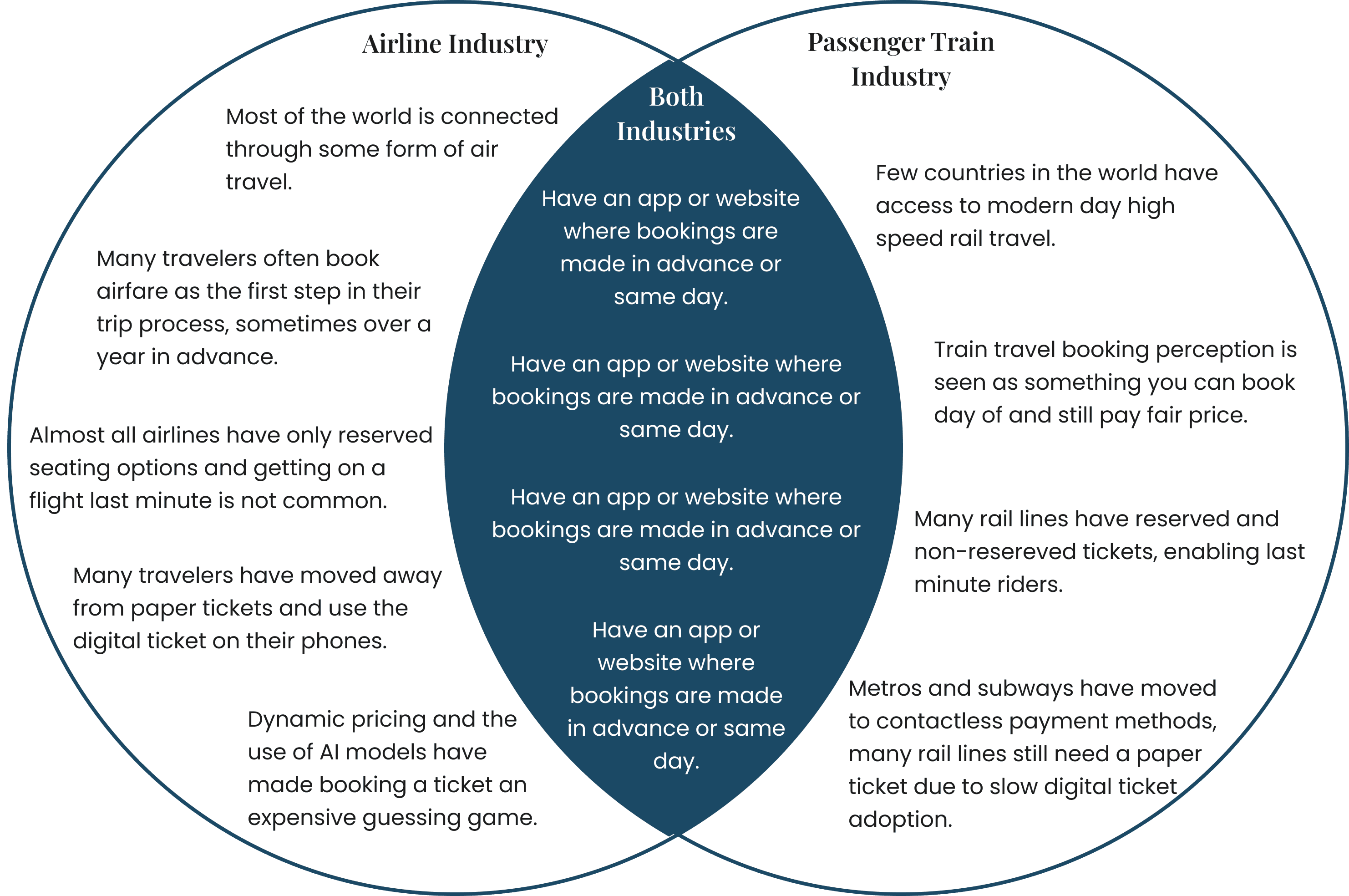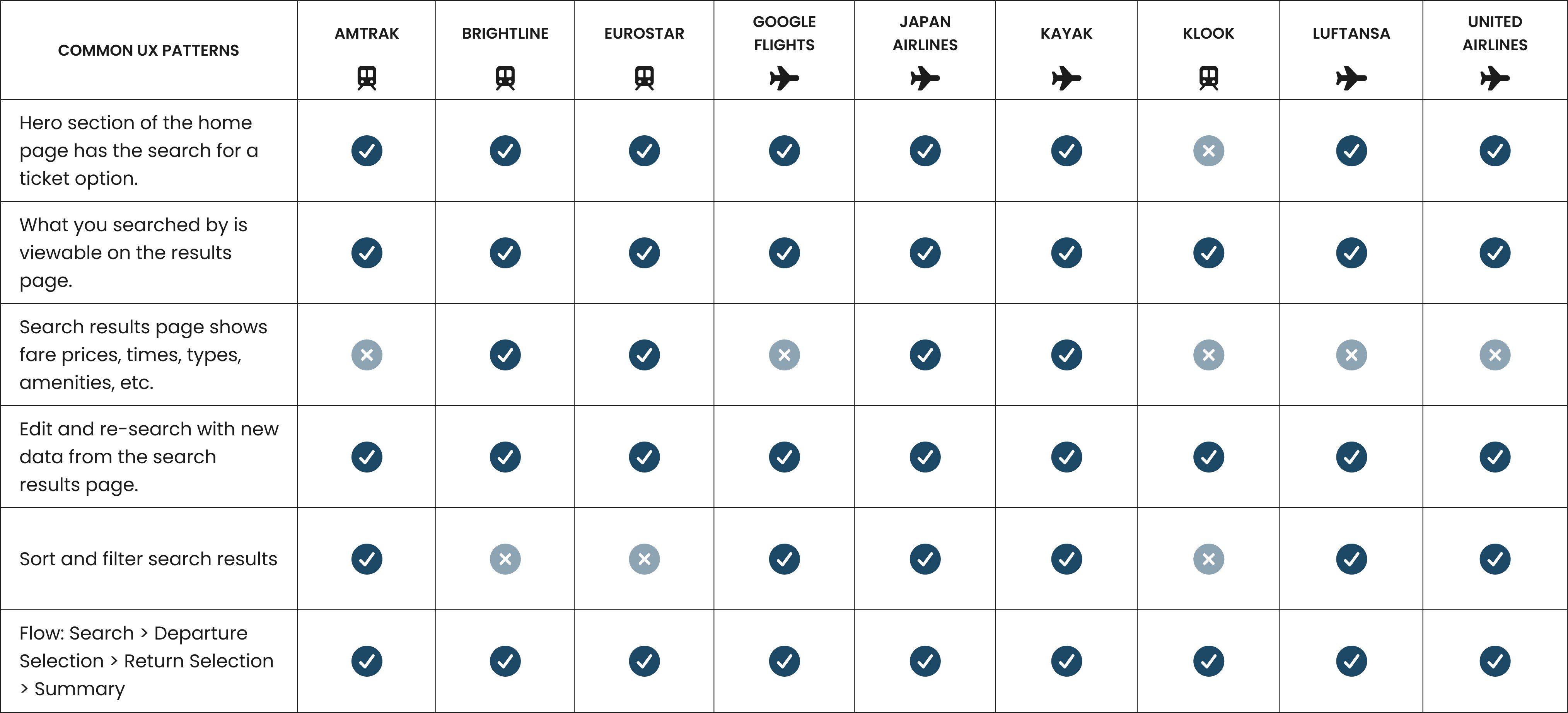 Taking a train and a flight from point A to B is a form of public transit that is increasingly digital, yet the UX of the two industries differs. If a user wants to get from A to B, both scenarios involve booking a ticket via these factors: