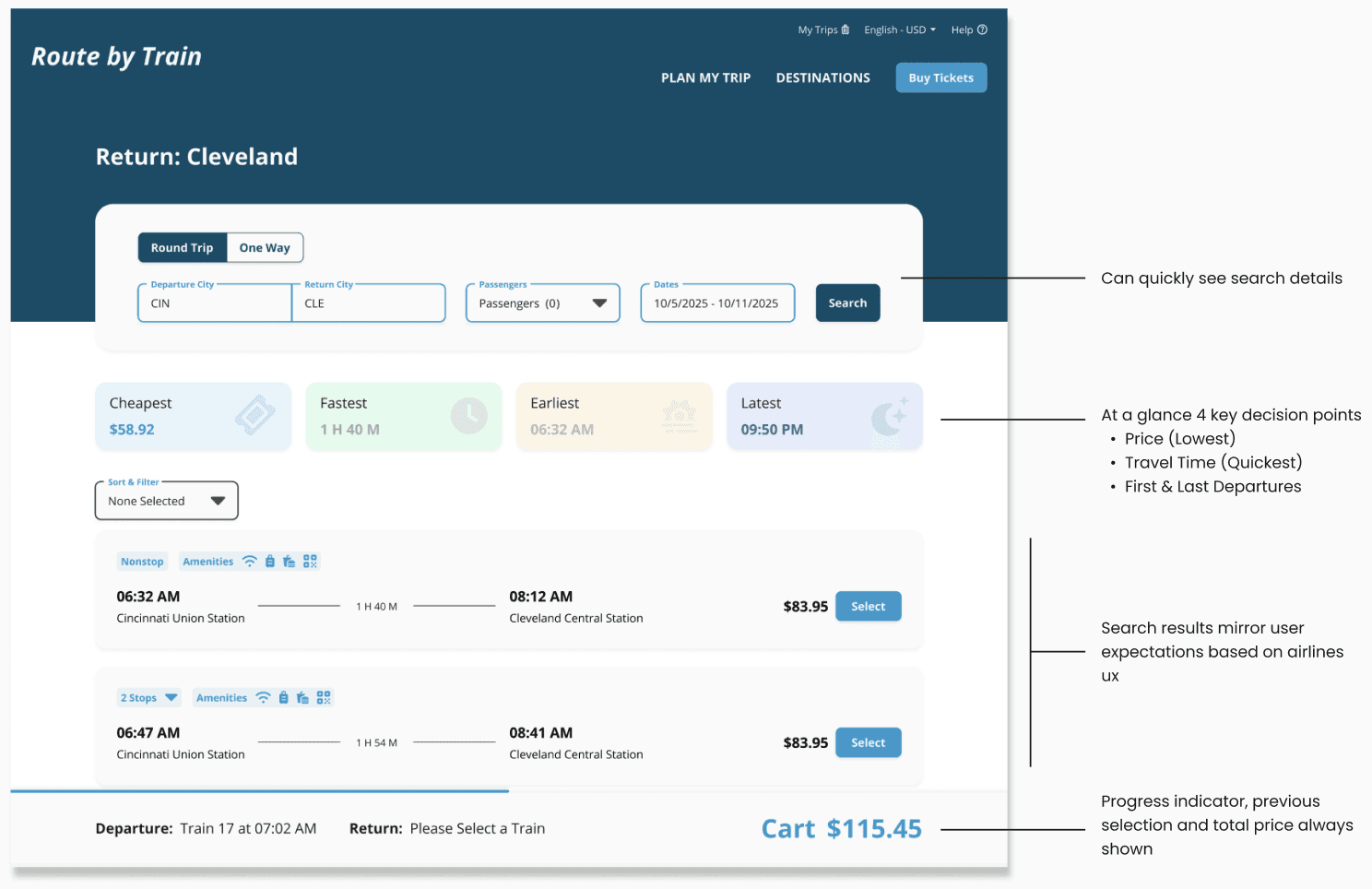 The search results page indicates to the user where they are in their search process and what trains are available for travel. Using a similar UX to airlines, users can see, at a glance, the price, amenities, travel time, and more.
