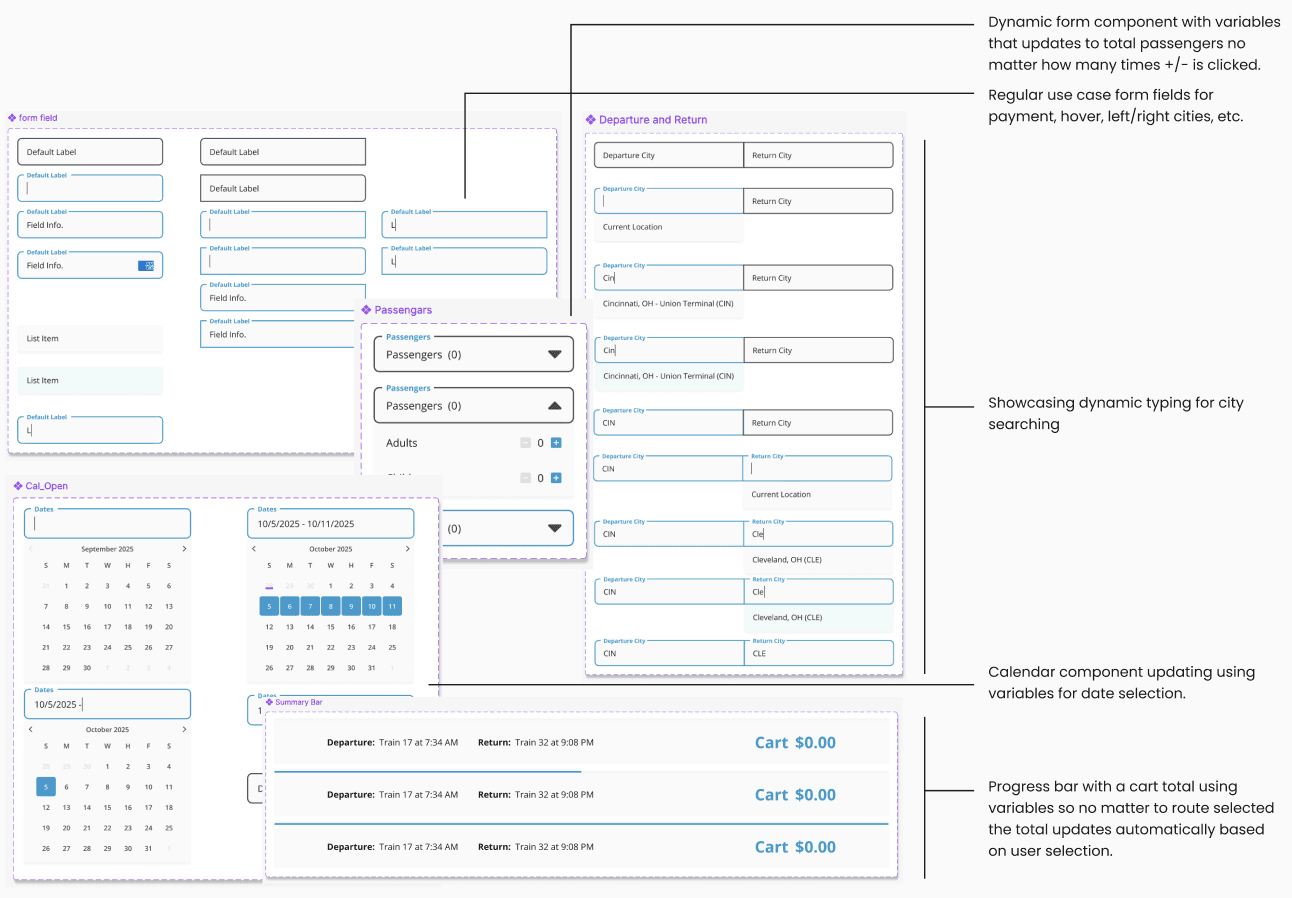 Starting with the initial concept, I learned to create Figma components, assembled a brand library, and prototyped a train route search flow using airline UX practices.